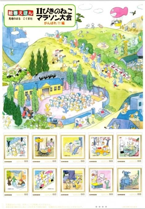 青森県三戸町出身の絵本作家・馬場のぼるさんの絵本シリーズ「11ぴきのねこ」をモチーフに発売されたフレーム切手シートシリーズの人気の『11ぴきのねこマラソン大会』のがんばれ編が新しい令和新料金63円10枚のフレームシール切手で新発売です!